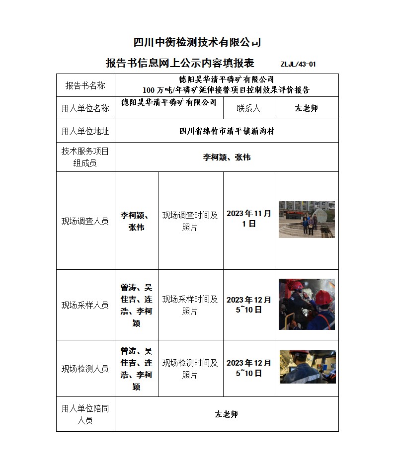 德陽昊華清平磷礦有限公司 100萬噸/年磷礦延伸接替項目 職業病危害控制效果評價報告書