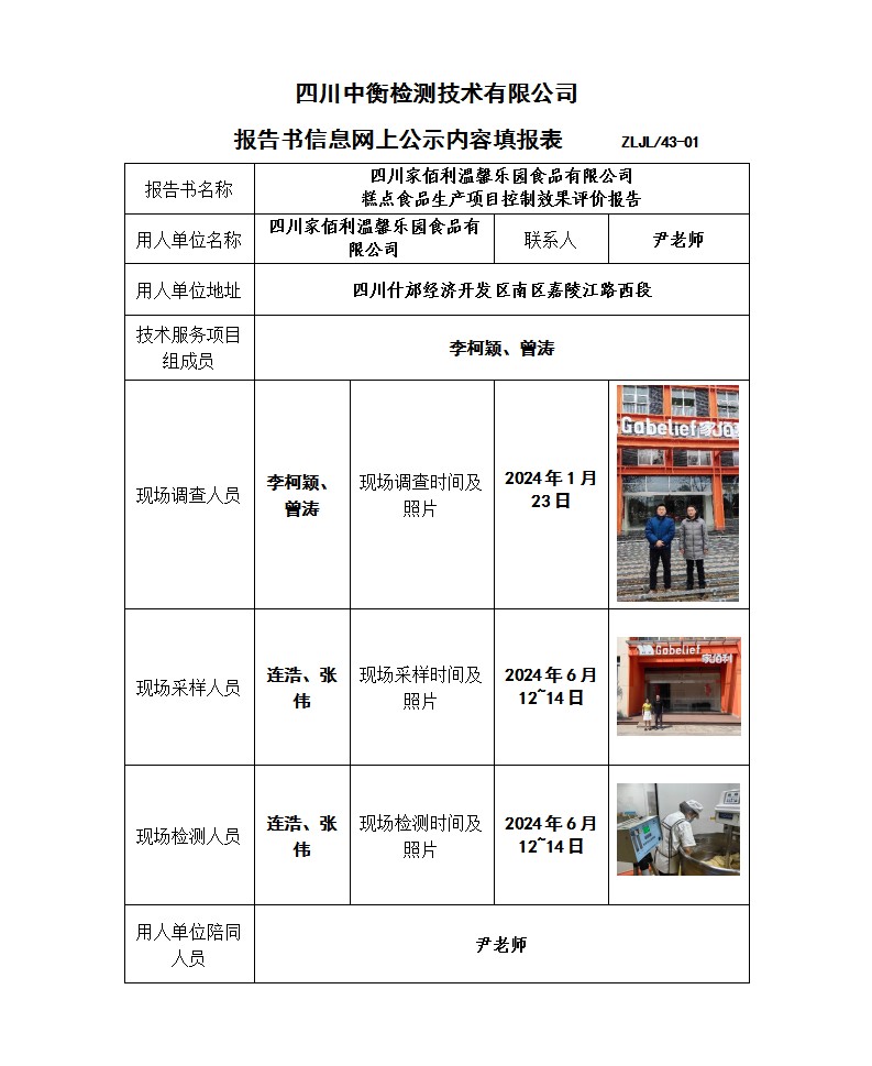 四川家佰利溫馨樂園食品有限公司 糕點食品生產項目 職業病危害控制效果評價報告書