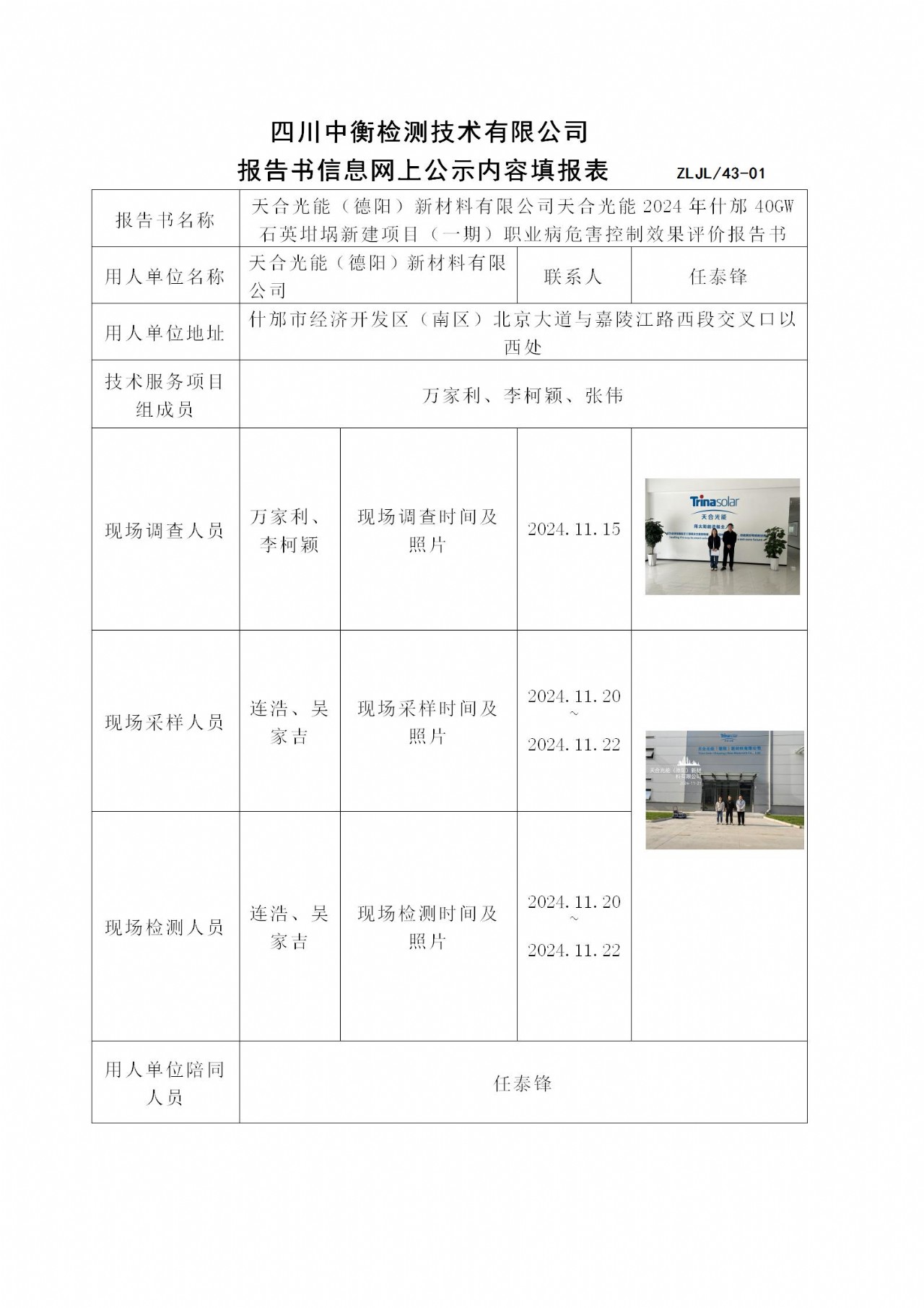 天合光能(德陽)新材料有限公司天合光能2024年什邡40GW石英坩堝新建項目(一期)職業病危害控制效果評價