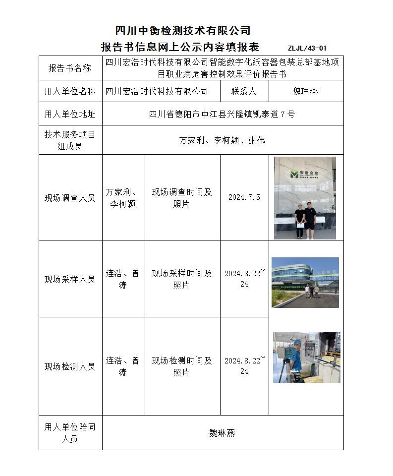 四川宏浩時代科技有限公司智能數字化紙容器包裝總部基地項目職業病危害控制效果評價