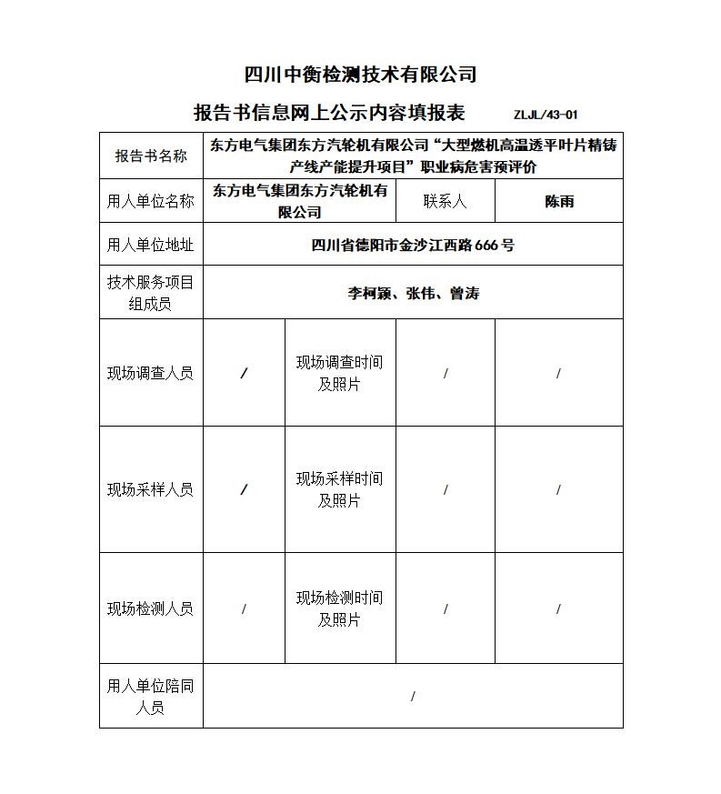 東方電氣集團(tuán)東方汽輪機(jī)有限公司“大型燃機(jī)高溫透平葉片精鑄產(chǎn)線產(chǎn)能提升項(xiàng)目”職業(yè)病危害預(yù)評(píng)價(jià)